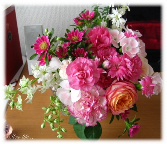 母の日が近いためカーネーション率が高いがピンクにしてくれてちょっと嬉しいぞ
